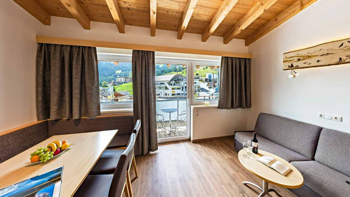 Balkon mit Kaffeetisch, Liegestuhl und Ausblick auf die umliegenden Berge