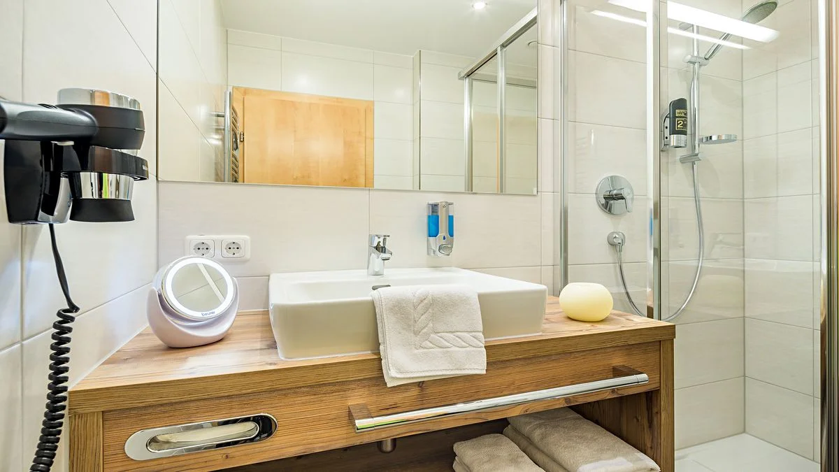 Bademantel und Badeschlappen auf Wunsch (kostenpflichtig).